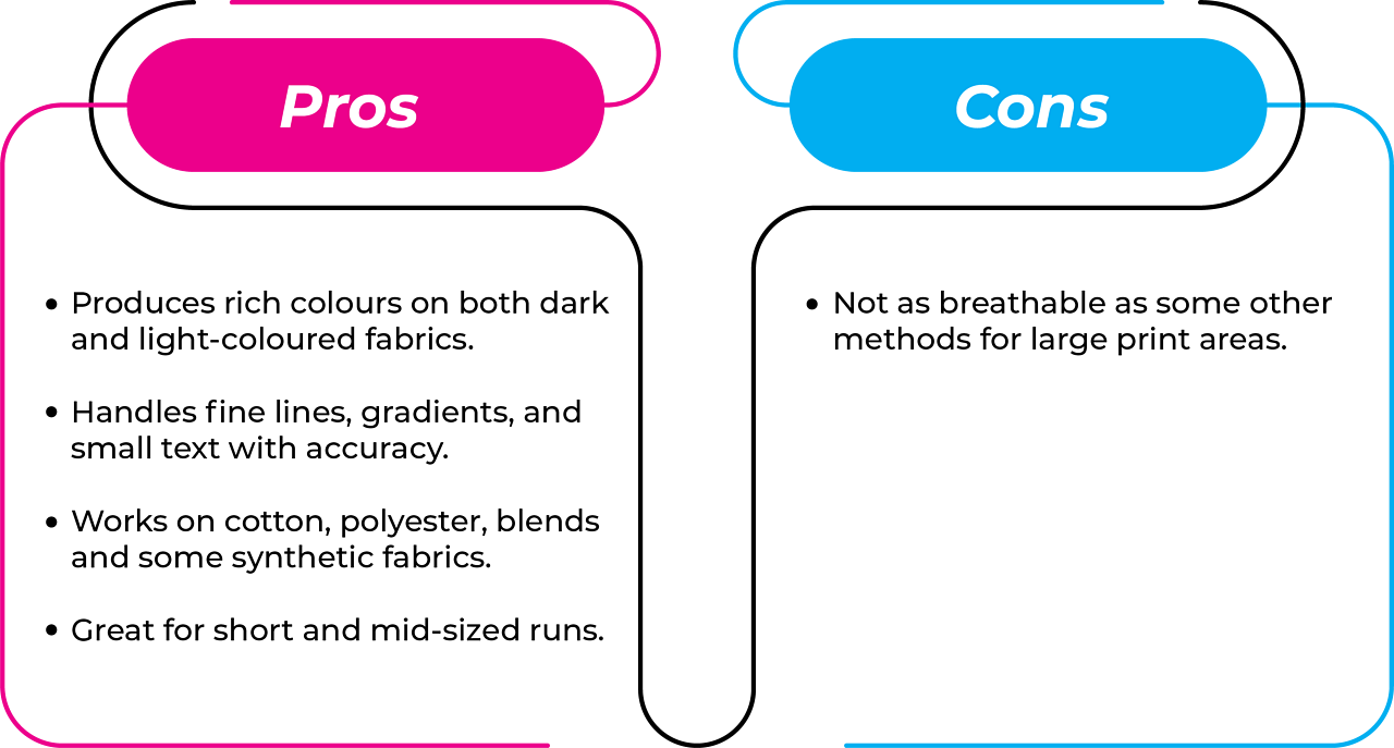This results in a print that is smooth in texture with vibrant colours that bond firmly to the garment’s surface. This printing is best suited for printing detailed artwork, full-colour images, or gradients. DTF printing provides designs that are detailed and complex without losing clarity.
