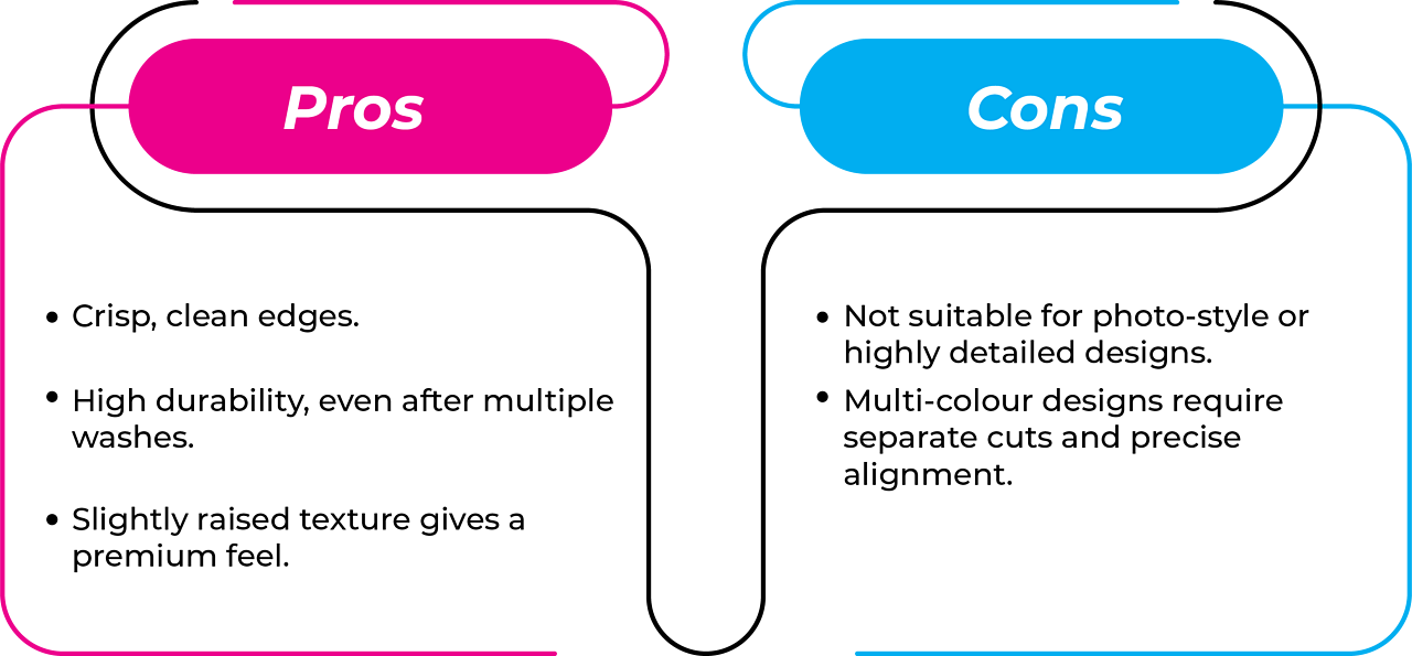 It is a very clean process resulting in bold and popping colours. You will not experience any bleeding, gradient, or fuzziness, as vinyl is solid-coloured and not printed with ink. This will create a sharp, high-contrast finish with clean edges for text, logos, and shapes.